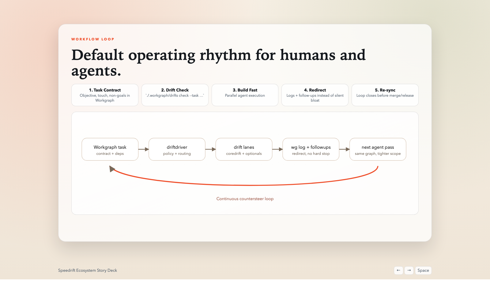 Speedrift started, in my head and in practice, much closer to a repo-local drift checker. Useful, yes, but narrower. Over time it has evolved into something much more interesting: a multi-repo, model-mediated operations system with bounded autonomy. That matters because it forces the right questions.